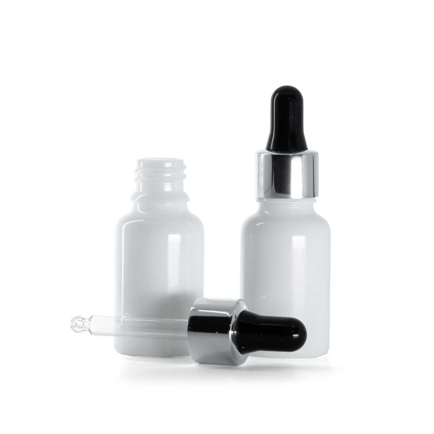 Fehér üvegpalack fekete-ezüst cseppentővel, 15 ml