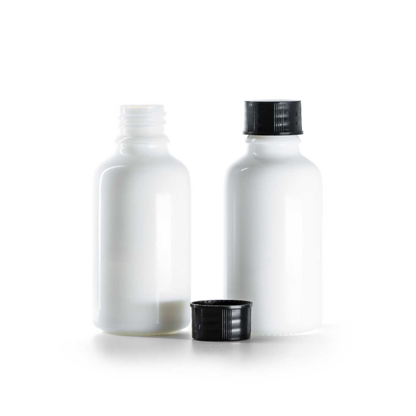 Fehér üvegpalack, fekete kupak, 30 ml
