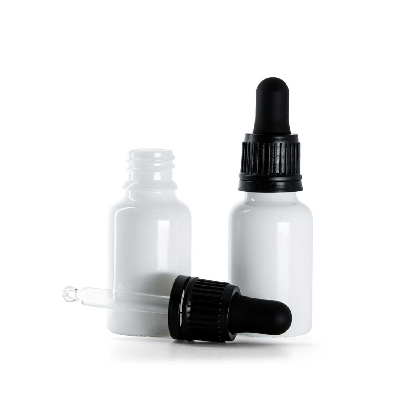 Fehér üvegpalack fekete, manipulálásbiztos cseppentővel 15 ml