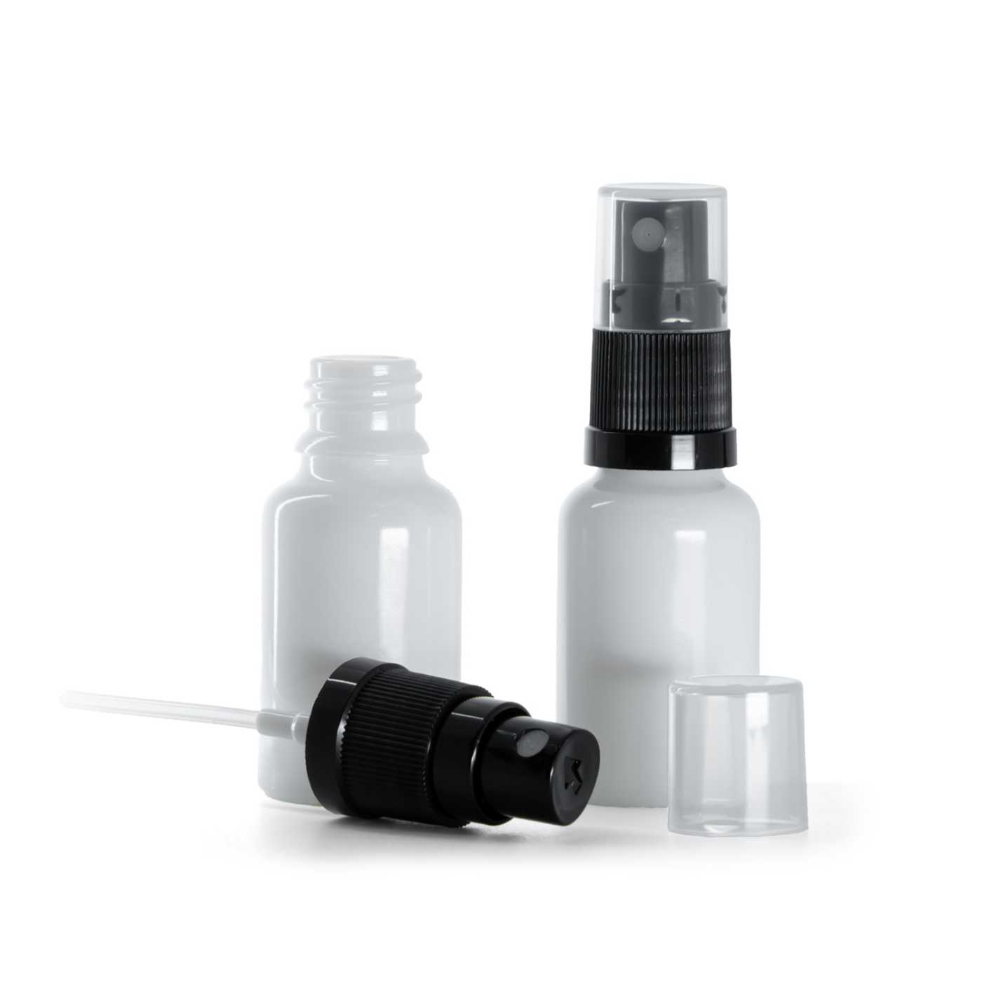 Fehér üvegpalack fekete permetezővel, 15 ml