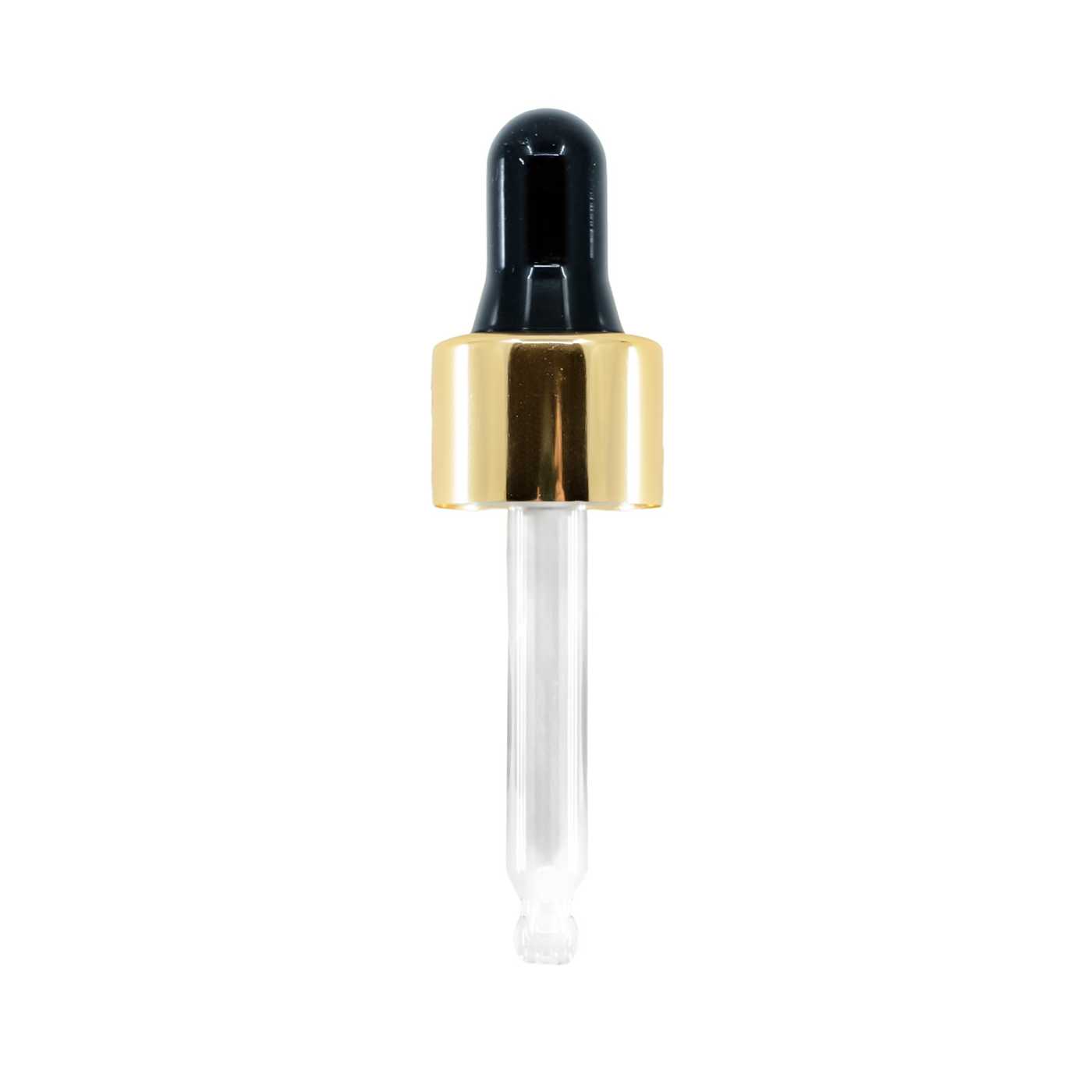 Fekete/arany fényű üvegcseppentő, 18 mm nyakátmérőjű és 10 ml térfogatú üveghez. Üvegcső hossza: 53 mmAnyag: üveg, szilikon, alumínium, műanyag