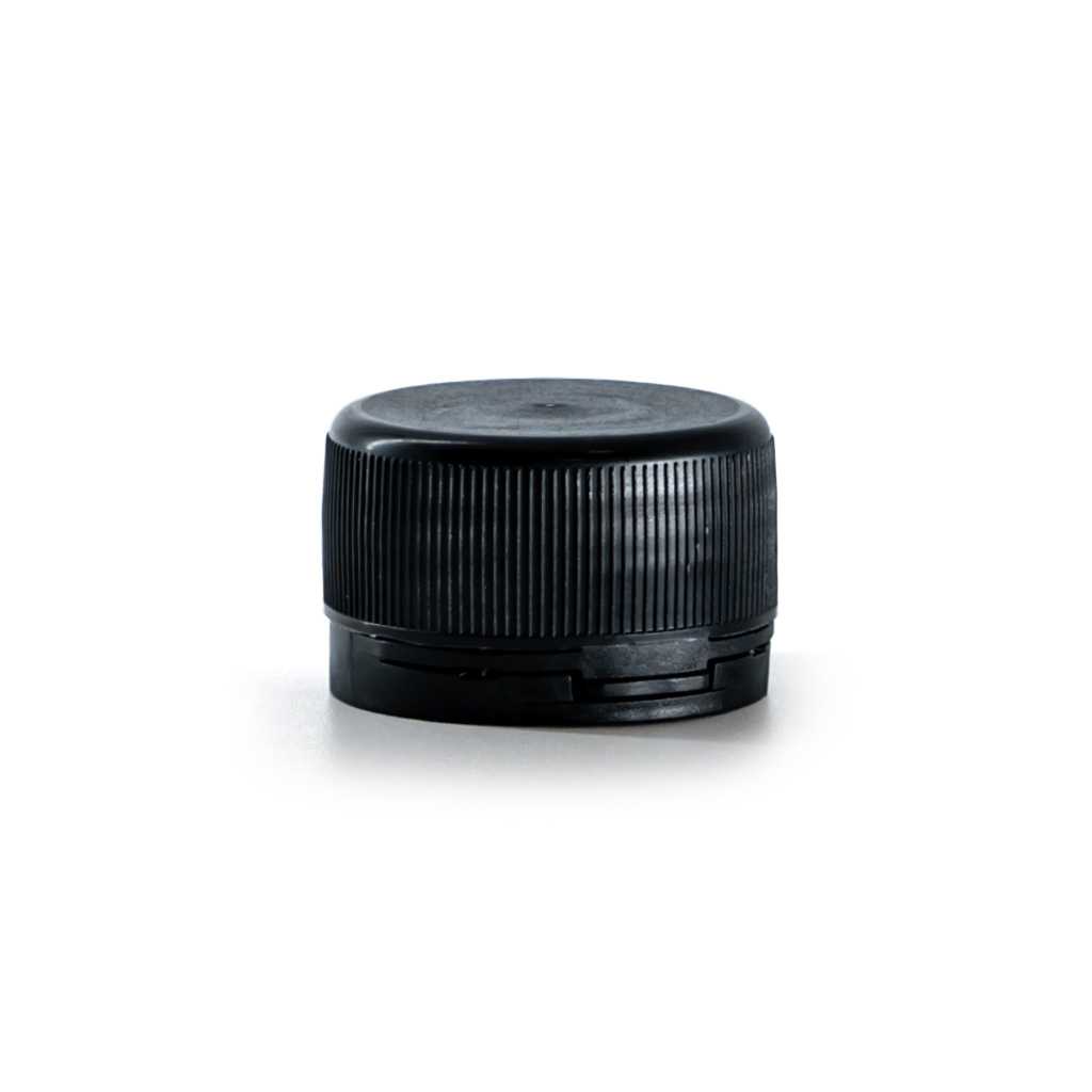 Műanyag kupak palackra, fekete egy megbízható, HDPE anyagú csavaros záróelem, amelyet kompatibilis palackok szilárd és biztonságos lezárására terveztek. Alkalmas kozmetikai, élelmiszeripari és technikai termékekhez, ahol fontos a csomagolás egyszerű és stabil lezárása.