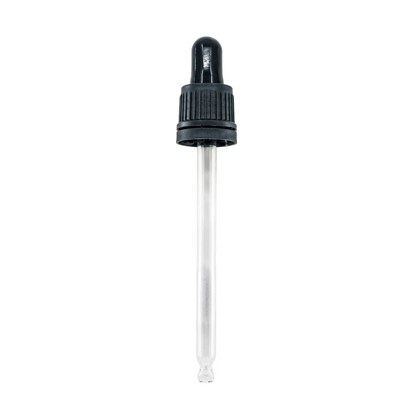 Fekete műanyag cseppentő biztonsági gyűrűvel, 18 mm nyakátmérőjű és 100 ml térfogatú flakonhoz.