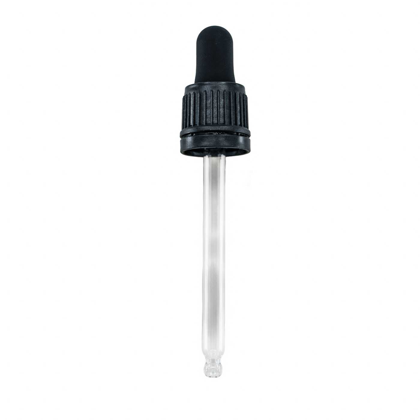 Fekete műanyag cseppentő biztonsági gyűrűvel, 18 mm nyakátmérőjű és 50 ml térfogatú flakonhoz.