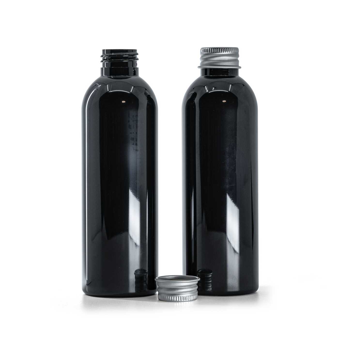 Fekete fényes műanyag palack, ezüst alumínium kupak, 200 ml
