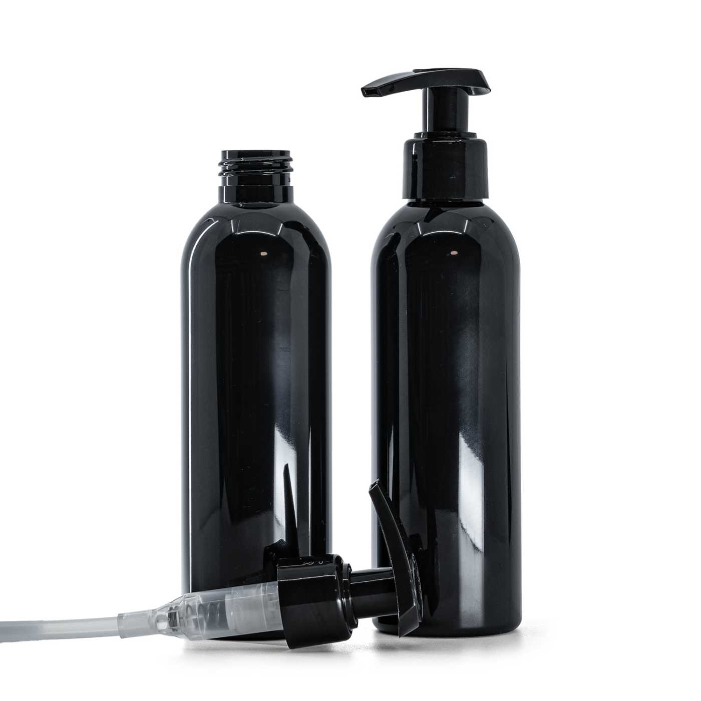 A fényes felületű, fekete adagolóval ellátott műanyag flakon elegáns és funkcionális csomagolási megoldást jelent folyékony készítmények számára, különösen a mo... teljes leírás