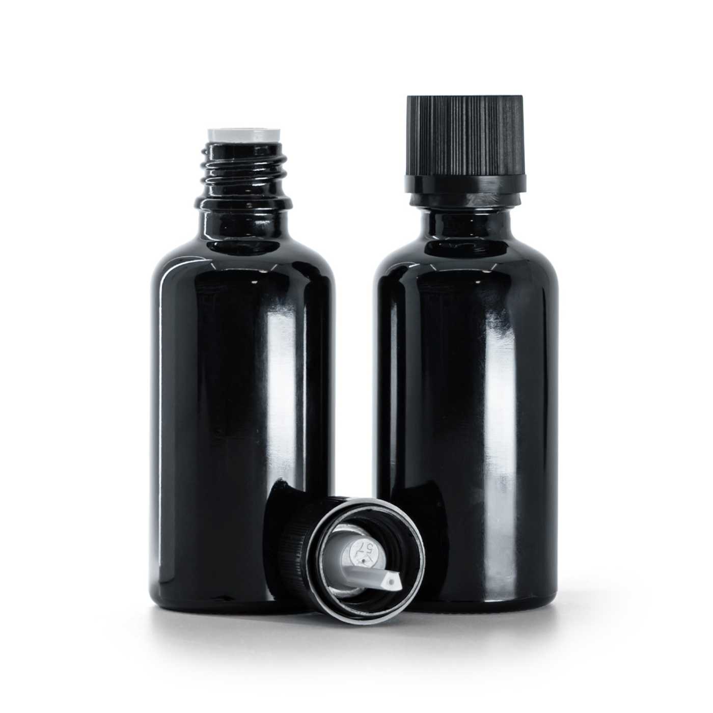 Fekete fényes üvegflakon, fekete biztonsági kupak cseppentőbetéttel, 50 ml