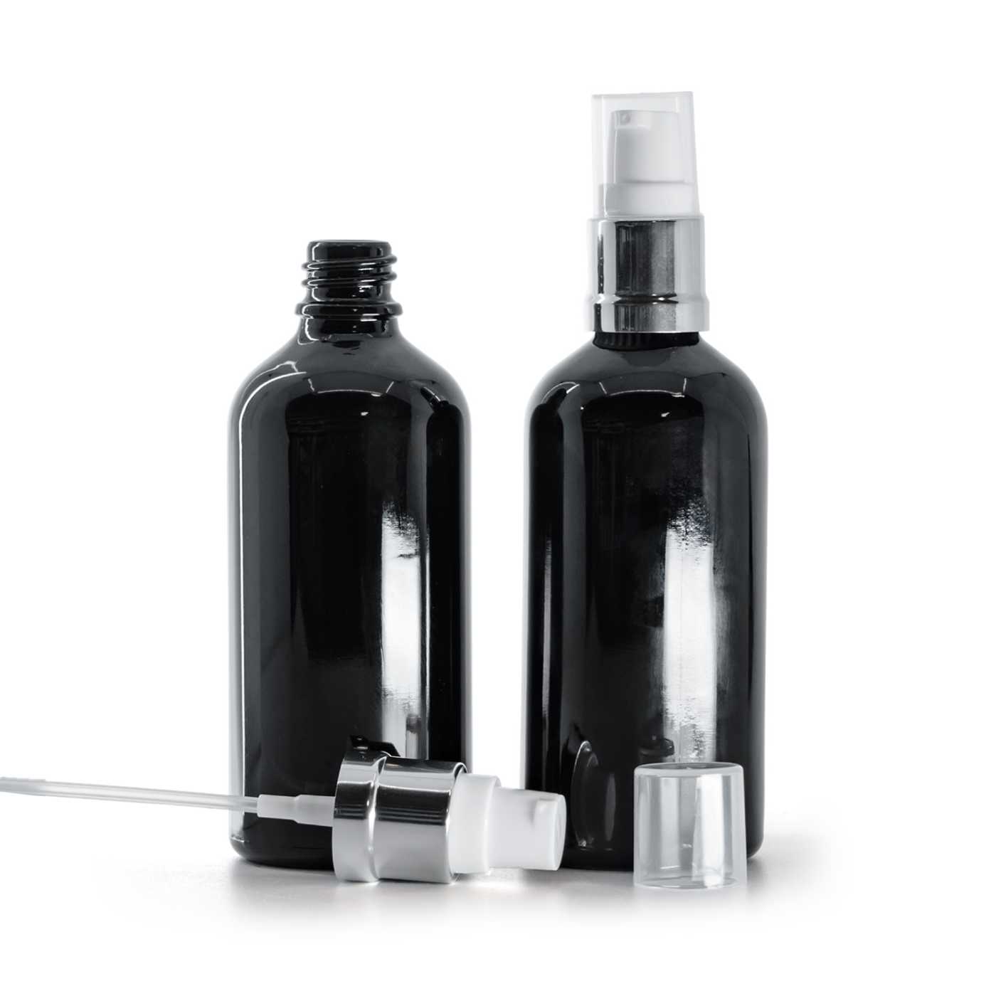 Fekete, fényes üvegpalack, fehér-ezüst fényes adagoló, 100 ml