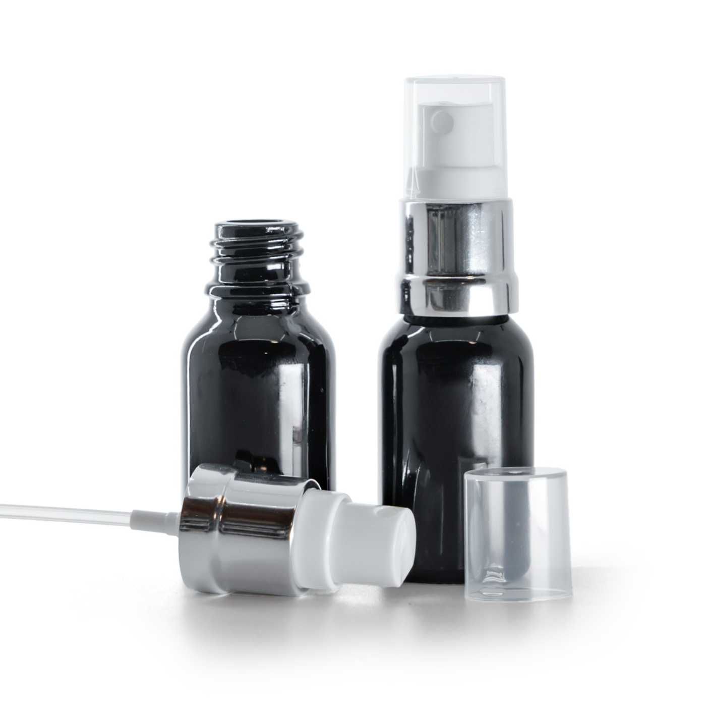 Fekete fényes üvegpalack fehér-ezüst permetezőfejjel 15 ml