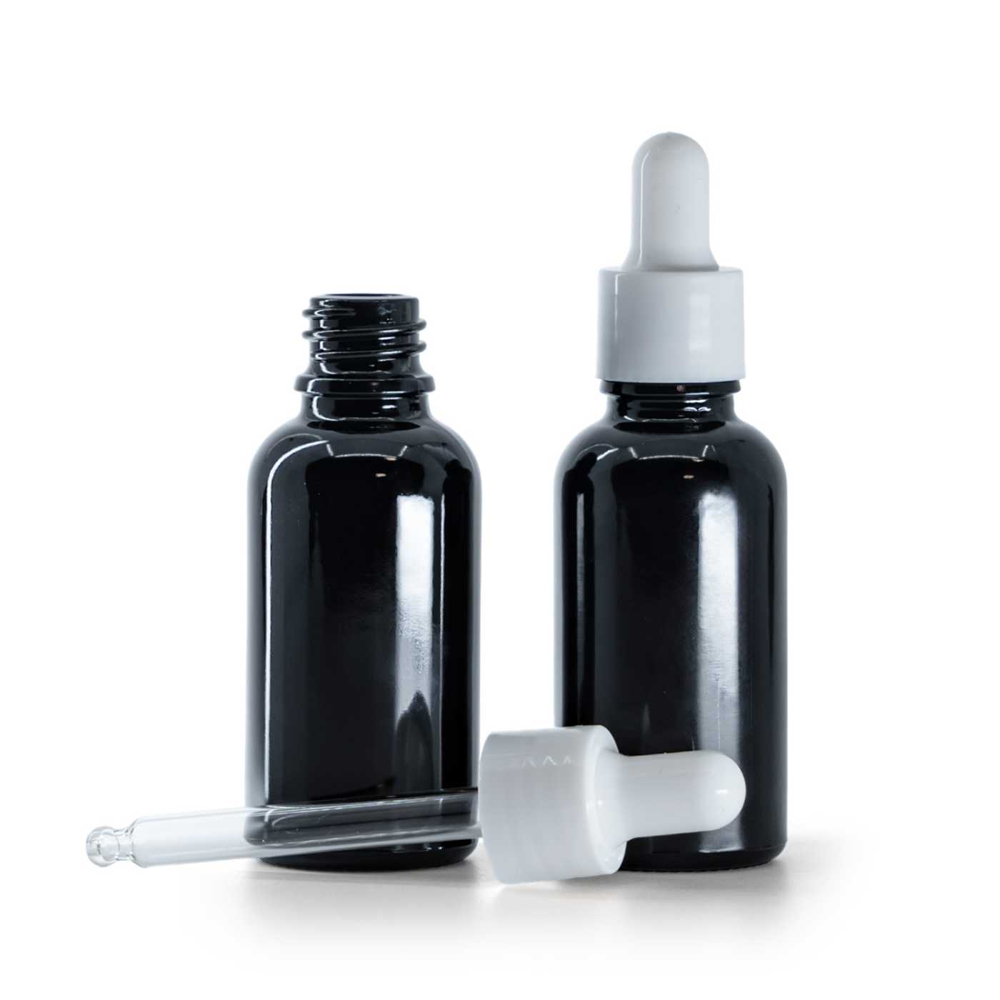 Fekete fényes üvegpalack, fehér fényes pipettával, 30 ml