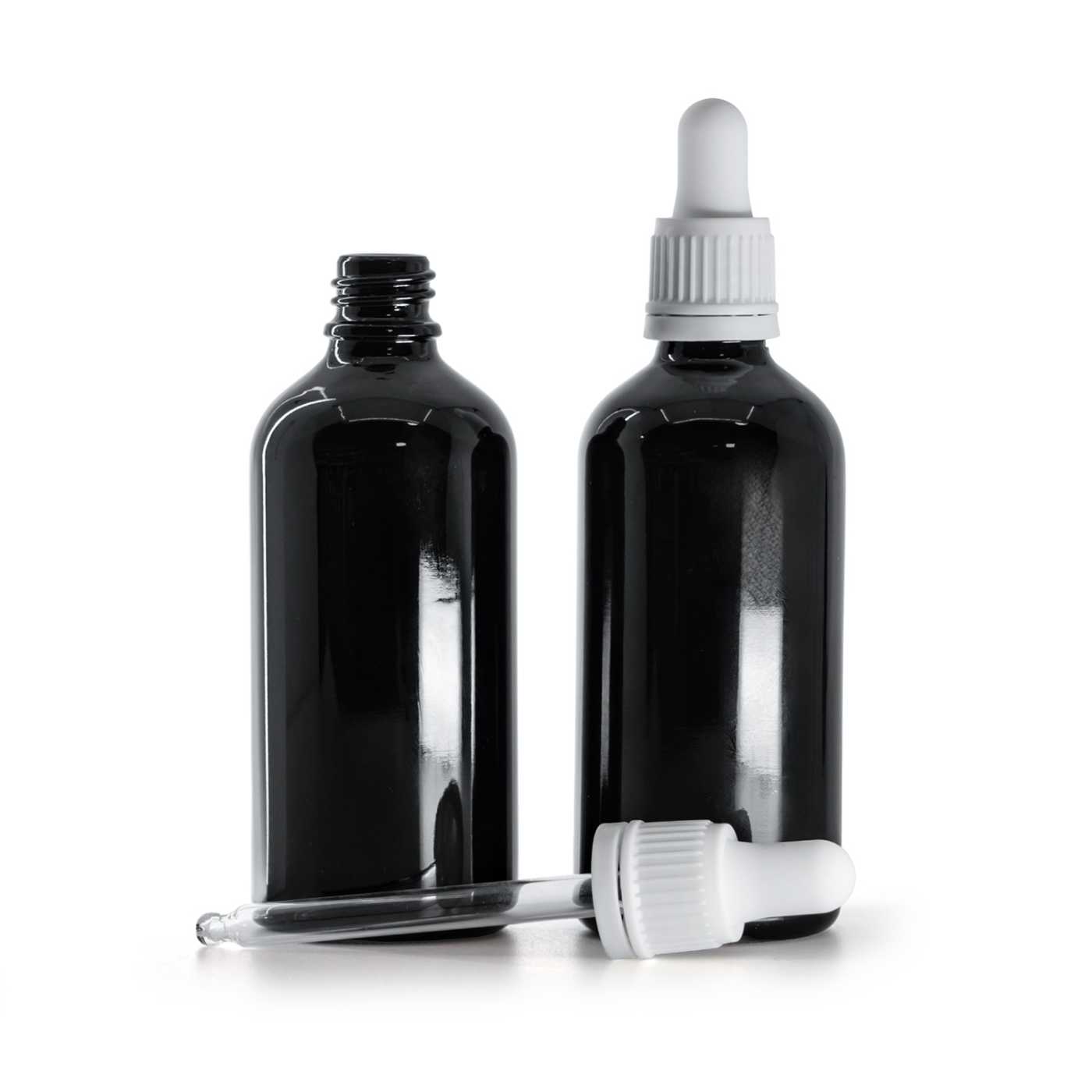 Fekete fényes üvegpalack fehér garanciazáras cseppentővel 100 ml