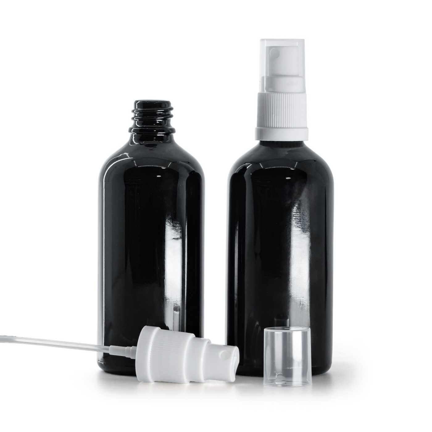 Fekete fényes üvegpalack fehér permetezővel, 100 ml
