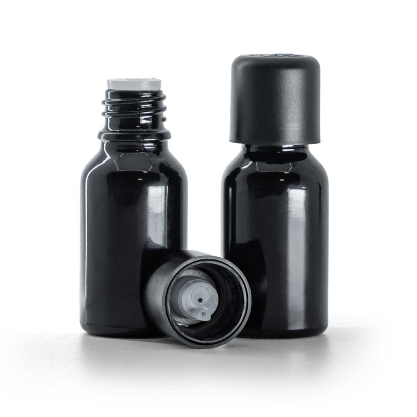 Fekete fényes üvegpalack, fekete garanciazáras cseppentős kupak, 15 ml