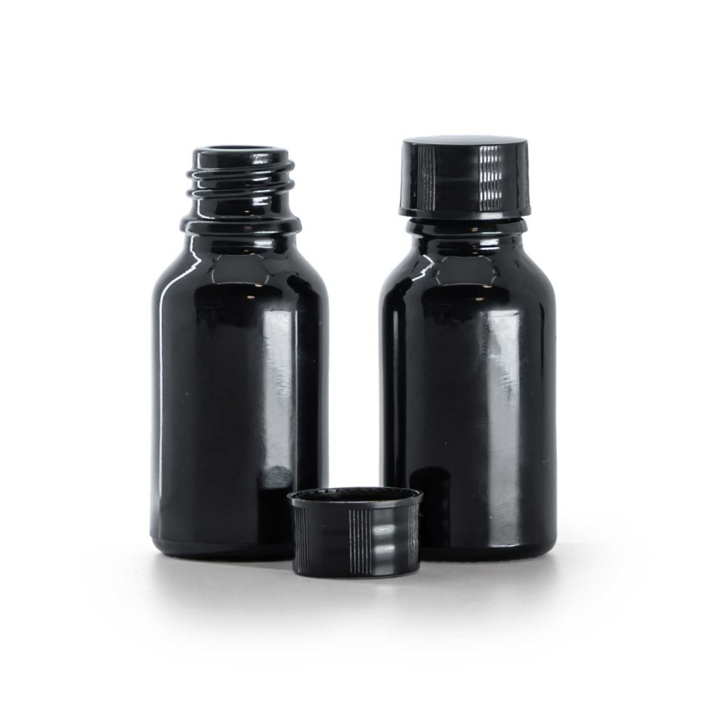 Fekete, fényes üvegpalack, fekete kupak, 15 ml