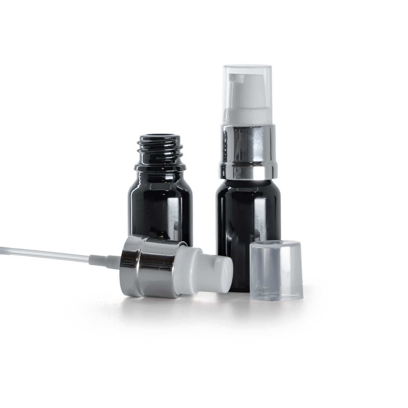 Fekete fényes üvegpalack, fényes ezüst-fehér adagoló, 10 ml