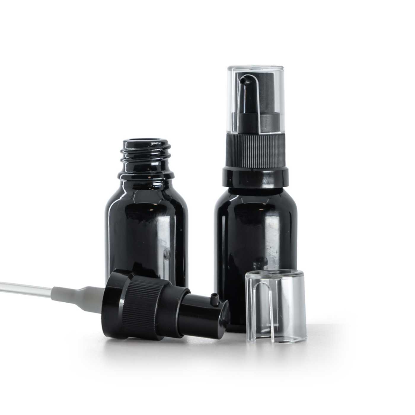 Fekete fényes üvegpalack, olajadagoló pumpa, 15 ml