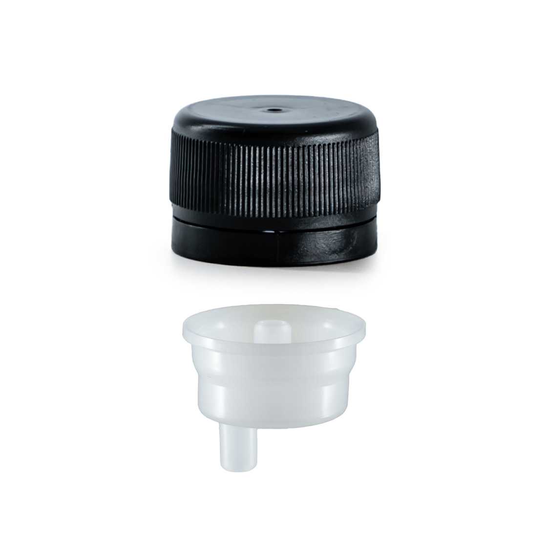 Fekete műanyag kupak átlátszó cseppentővel, 28 mm-es nyakú palackokhoz.