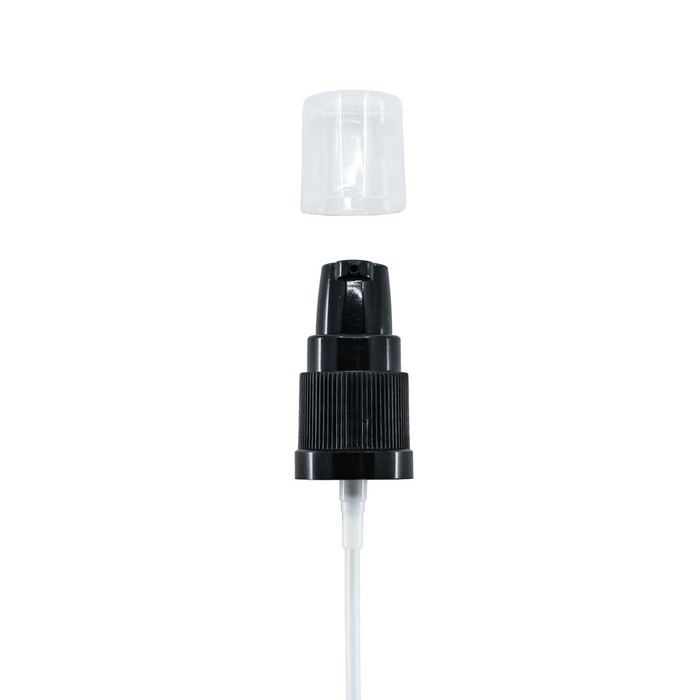 Fekete műanyag krémadagoló átlátszó kupakkal. 18 mm nyakátmérőjű flakonokhoz alkalmas.