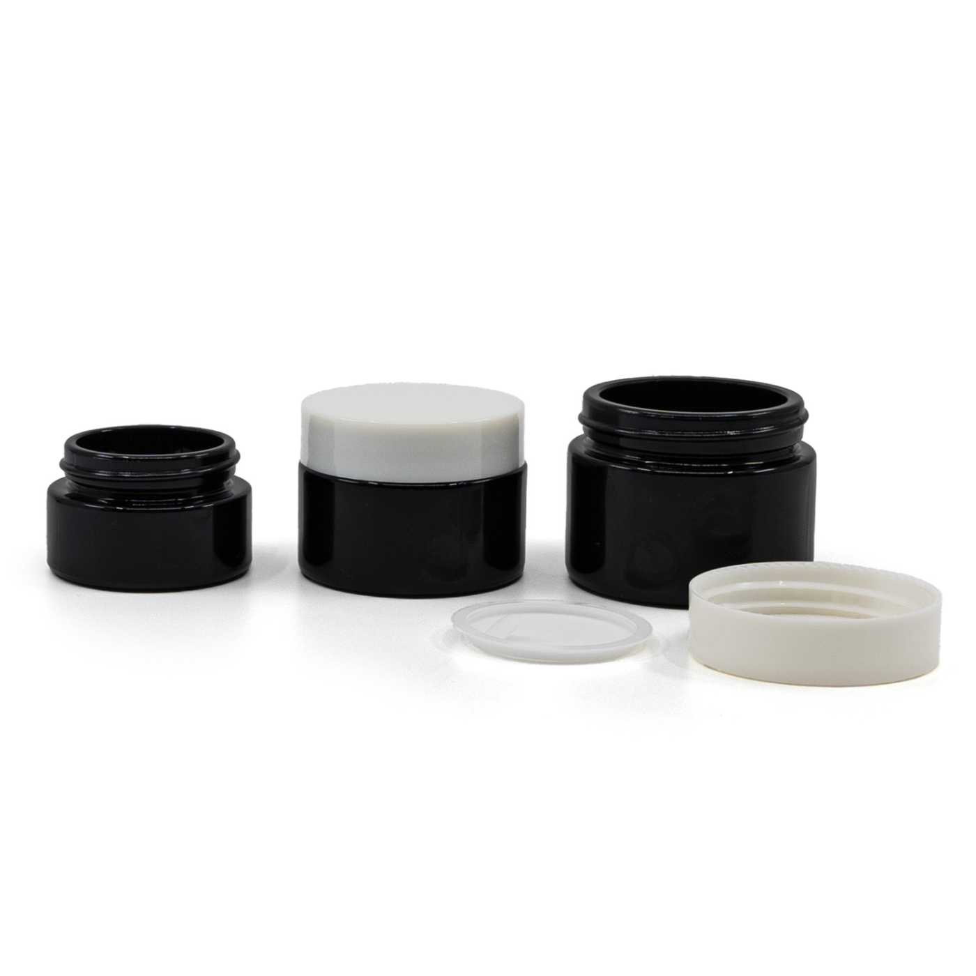 Fényes fekete üvegkrémes tégely fehér kupakkal 30 ml
