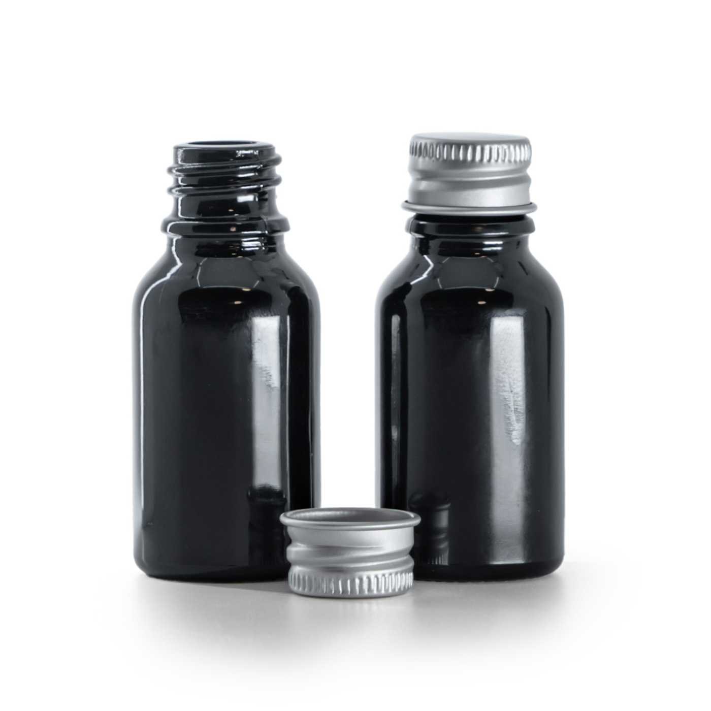 Fényes fekete üvegpalack ezüst alumínium kupakkal 15 ml
