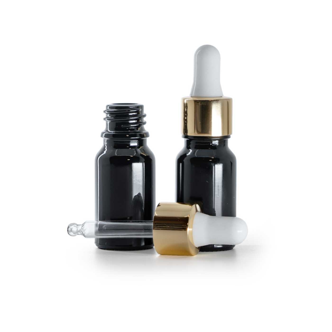 Fekete fényes üvegpalack, fehér-arany cseppentő egy professzionális csomagoló és adagoló készlet a folyékony készítmények pontos felviteléhez. Az átlátszatlan fekete üveg természetesen korlátozza a fény behatolását, és segít megvédeni a tartalmat az UV-sugaraktól, ami különösen hasznos az érzékenyebb hatóanyagoknak, kivonatoknak és olajkeverékeknek. A csomagolás élelmiszer-minőségű, ezért a higiéniai elvek betartása mellett belső használatra szánt, kiválasztott folyékony termékekhez is alkalmas.