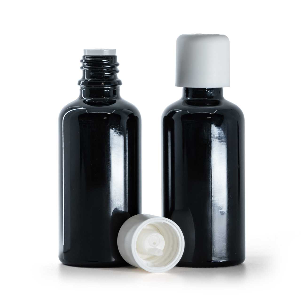 Fényes fekete üvegpalack fehér biztonsági kupakkal és cseppentővel, 50 ml