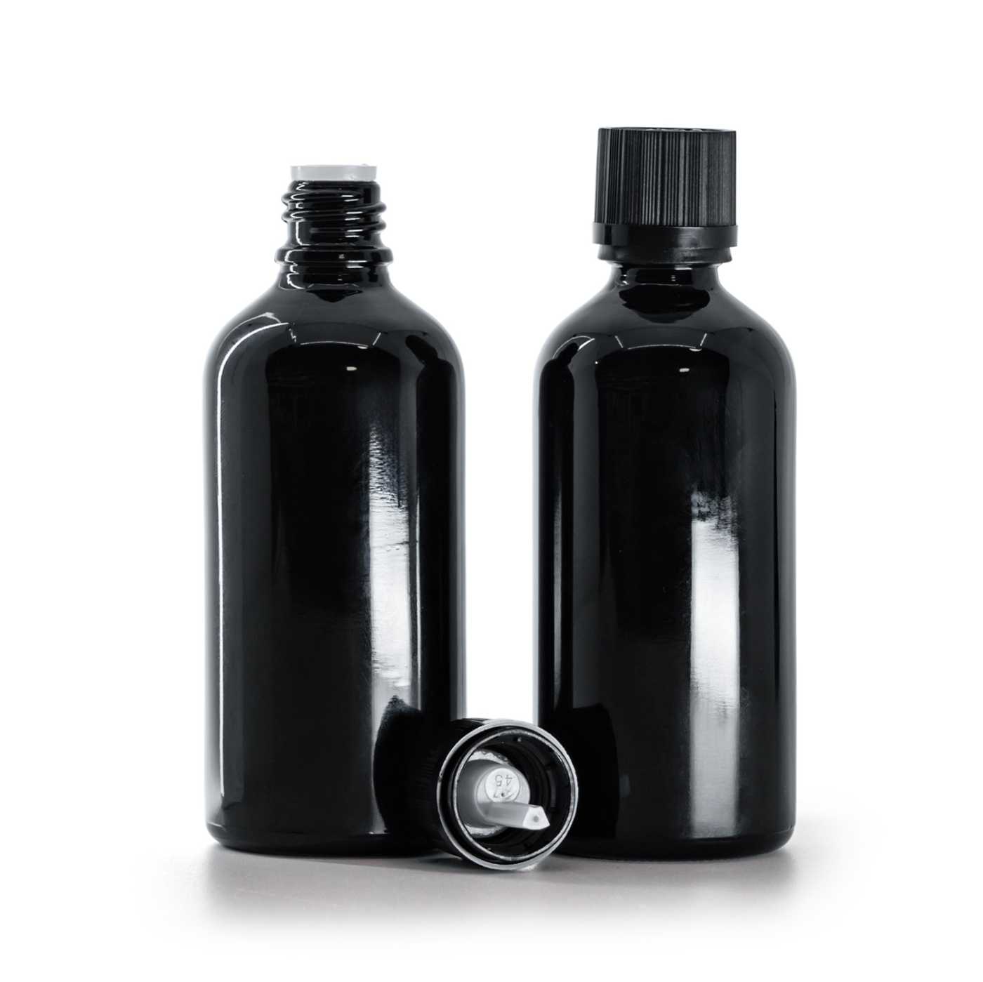 Fényes fekete üvegpalack, fekete biztonsági kupak cseppentővel, 100 ml