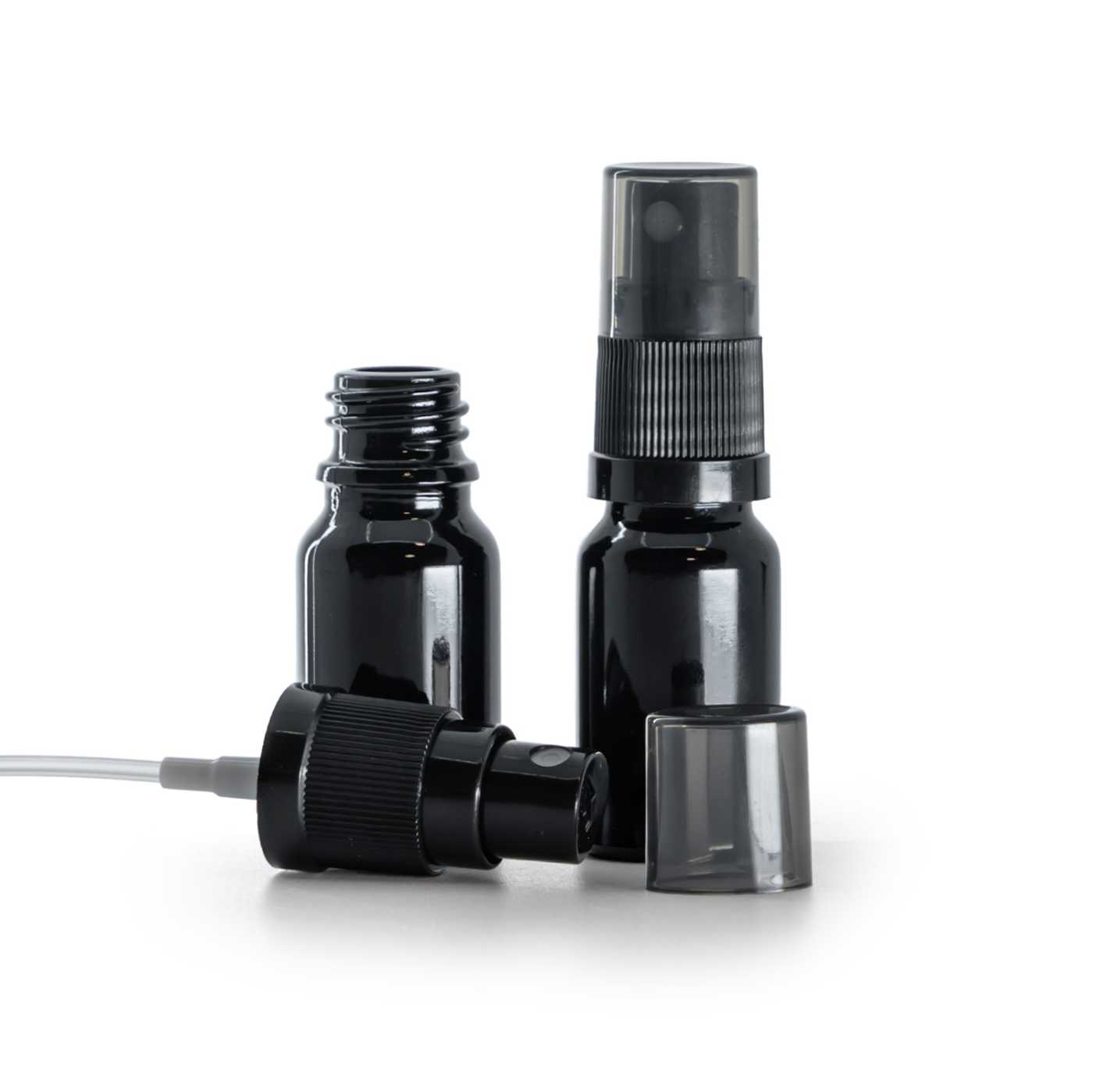 A fényes fekete színű, fekete porlasztó és füstös tetejű üvegpalack egy kompakt készlet folyékony termékek csomagolásához és alkalmazásához finom köd formájában... teljes leírás