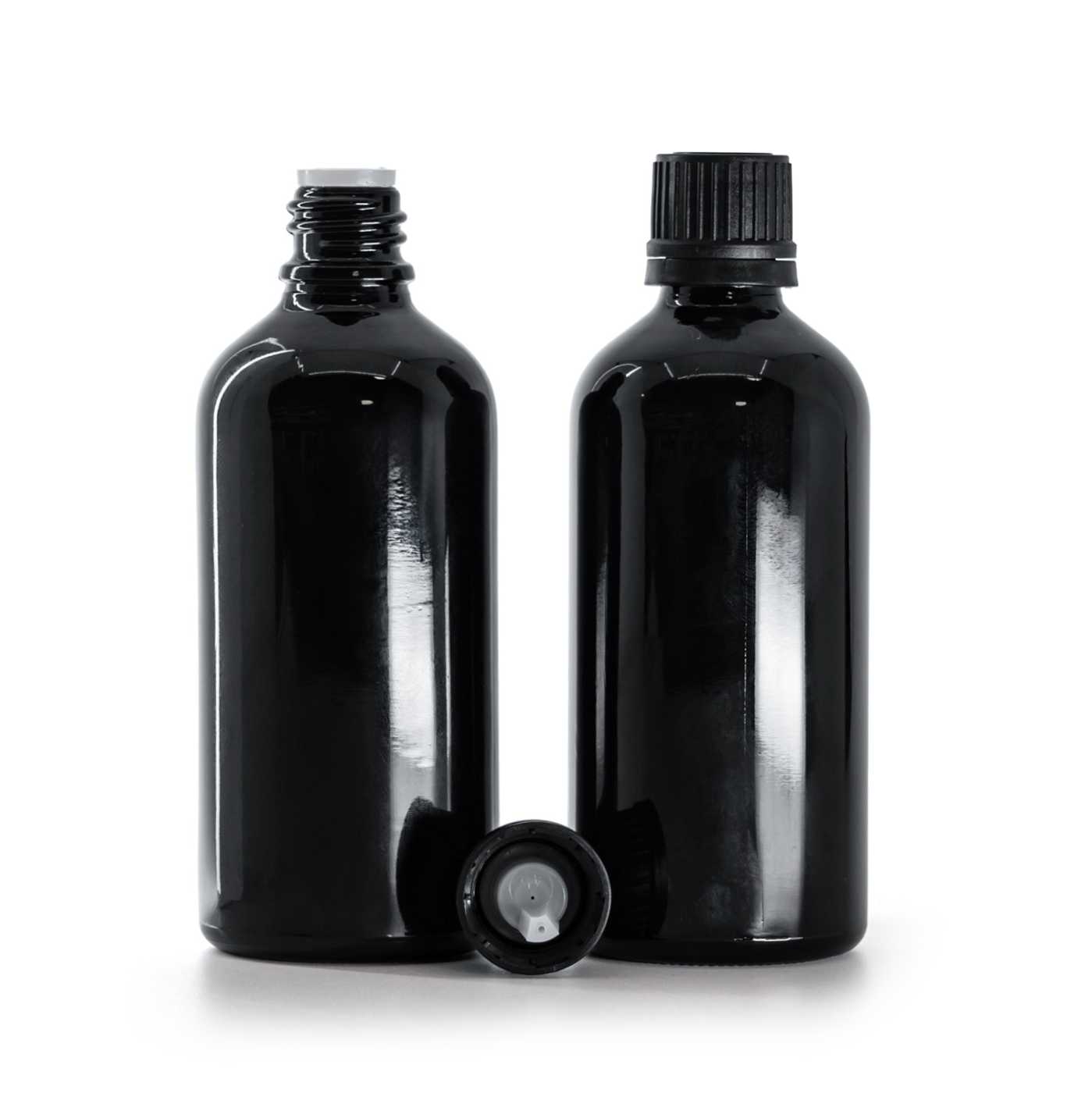 Fényes fekete üvegpalack fekete pipettás kupakkal, 100 ml