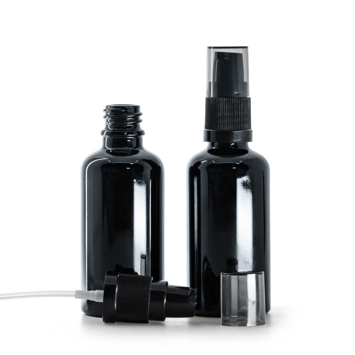 Fényes fekete üvegpalack, krémadagoló füstszínű kupakkal 50 ml