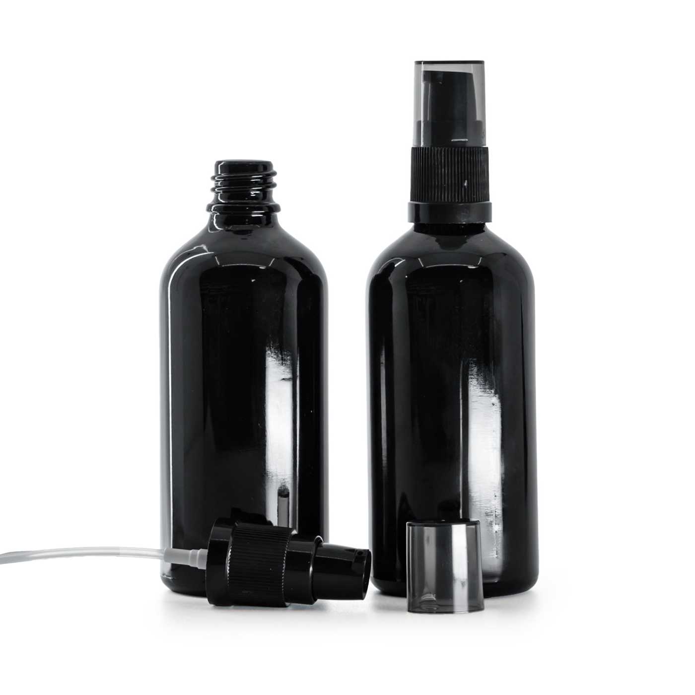 Fényes fekete üvegpalack, krémpumpával, füstös kupakkal, 100 ml