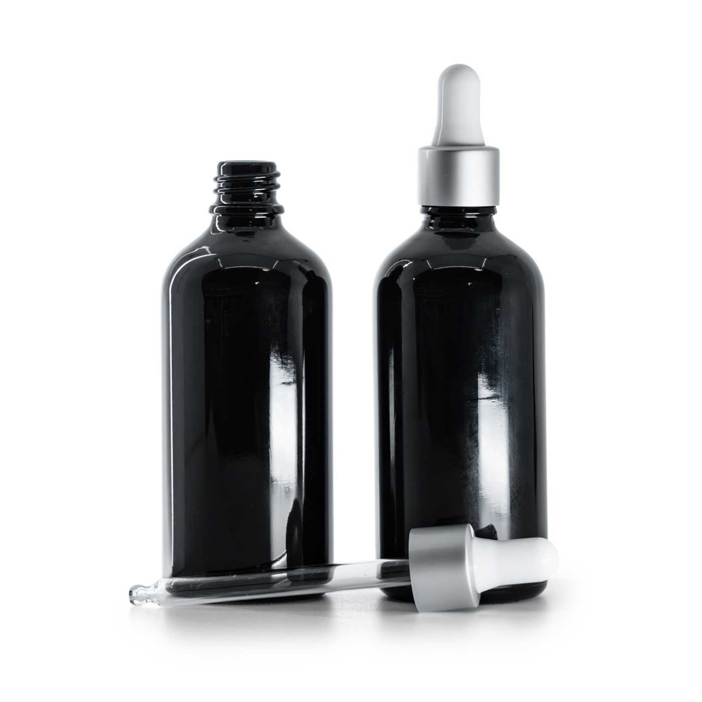 Fényes fekete üvegpalack, matt ezüst pipetta, 100 ml