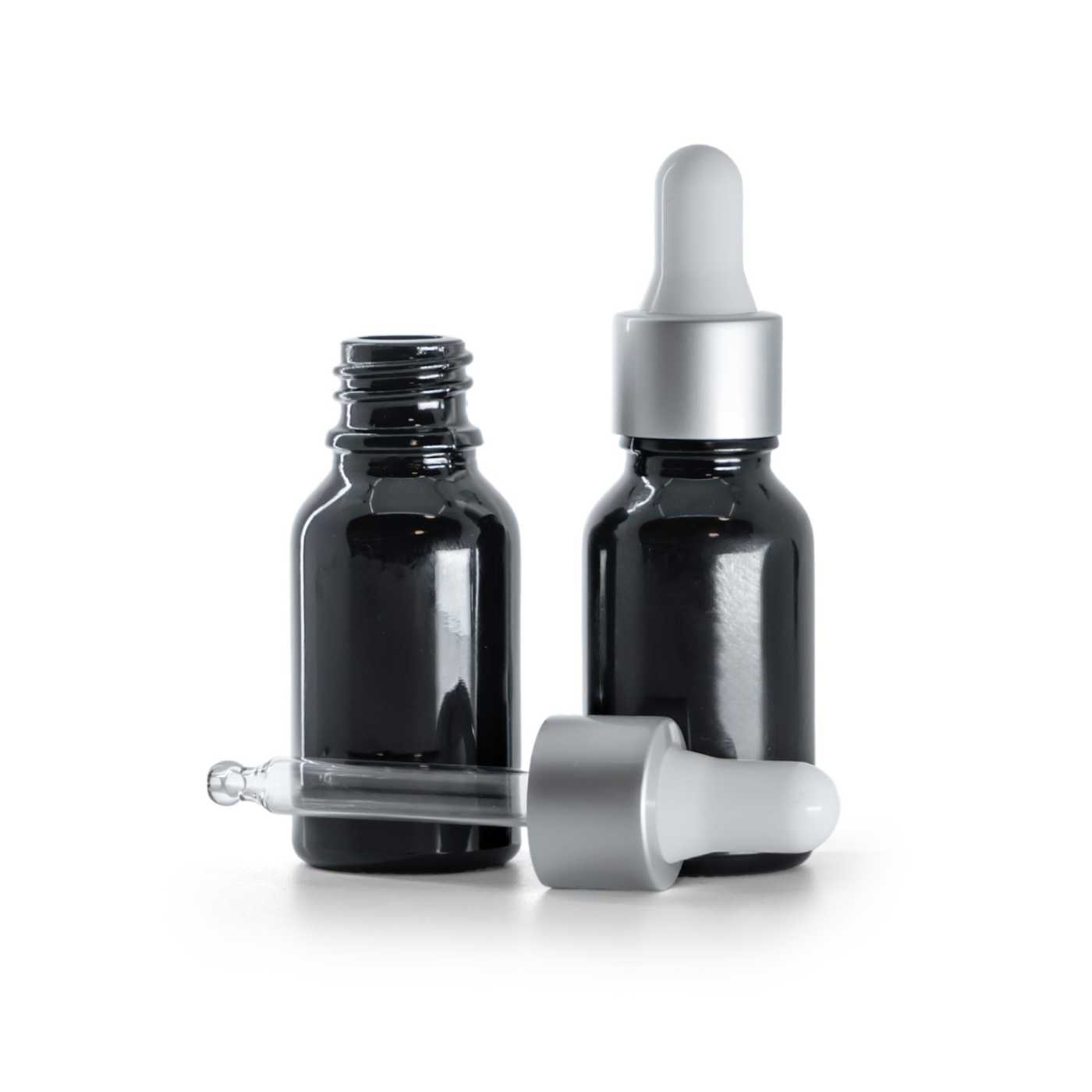 Fényes fekete üvegpalack, matt ezüst pipettás cseppentő, 15 ml