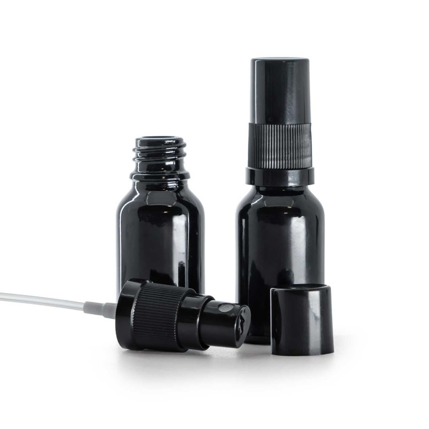 Fényes fekete üvegpalack, permetezőfej, fekete kupak, 15 ml