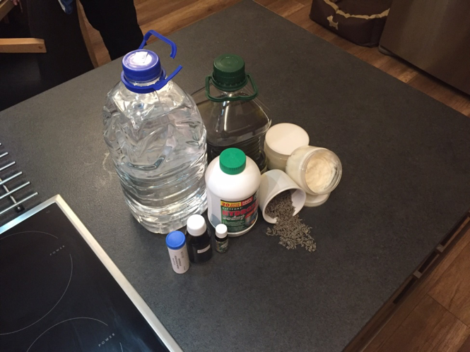 1. Készítsük elő az összes szükséges hozzávalót, esetünkben desztillált vizet és nátrium-hidroxidot (mindkét hozzávaló megvásárolható egy hagyományos drogériában), olívaolajat, kókuszolajat, ricinusolajat, illóolajat- levendula, szárított levendula, pH papírok, hőmérő, védőfelszerelés- kesztyű, arcmaszk, védőszemüveg