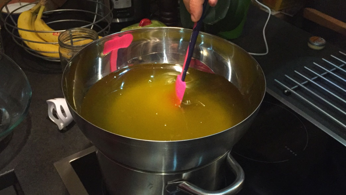 12. Amikor a szappanosítási folyamat befejeződött, vegye le a szappant a hőforrásról. Ezután következik az illóolajok és esetünkben a szárított gyógynövények hozzáadása. Az illóolajok párolgási hőmérséklete eltérő, ezért fontos, hogy a szappan hőmérséklete alacsonyabb legyen, mint az illóolaj párolgási hőmérséklete. Adjunk hozzá illóolajat, szárított gyógynövényeket.