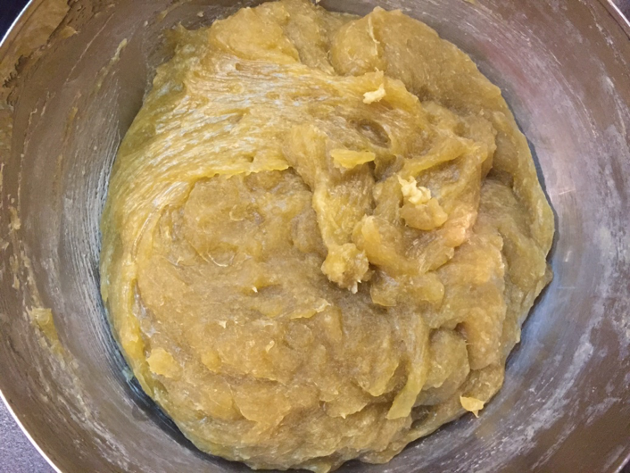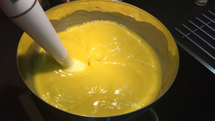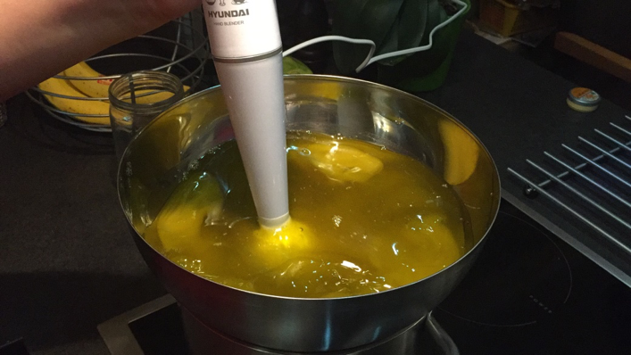 7. Lassan öntsük a hidroxidoldatot az olajkeverékbe, először egy spatulával keverjük össze.