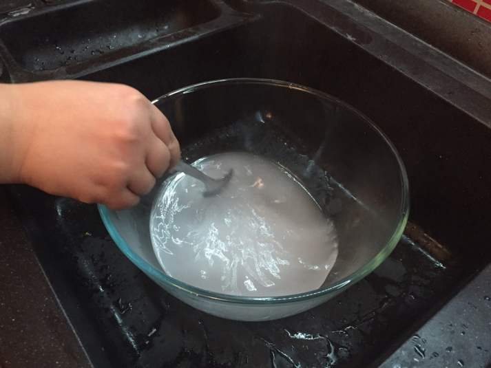 4. A mosogatóban öntsük a hidroxidot a desztillált vízbe, ügyelve arra, hogy MINDIG a vízbe öntsük a hidroxidot, NE a vízbe. Keverje meg a hidroxidot, ne lélegezze be a gőzt. A legjobb, ha az oldatot szellőztetett helyen vagy nyitott ablak mellett készíti el. A keletkező hidroxid magas hőmérsékletű, ezért hagyjuk lehűlni kb. 35 °C-ra