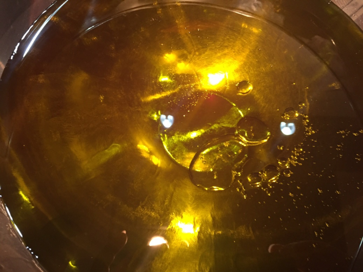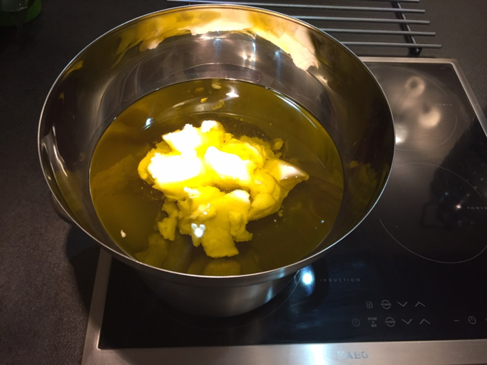 5. Amíg a hidroxid hűl, készítse el az olajkeveréket. Mérjük ki a szükséges mennyiségű olívaolajat, adjunk hozzá kókuszolajat és ricinusolajat. Olyan edényt használunk, amely alkalmas a vízfürdőhöz (esetünkben egy fémtálat)