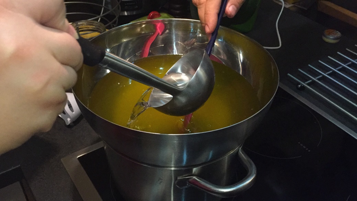 6. Tegyük a kimért olajokat a vízfürdőbe, hagyjuk, hogy a szilárd olajok feloldódjanak. Az olajoknak el kell érniük ugyanazt a hőmérsékletet, mint a hidroxidoldatnak.