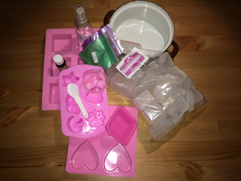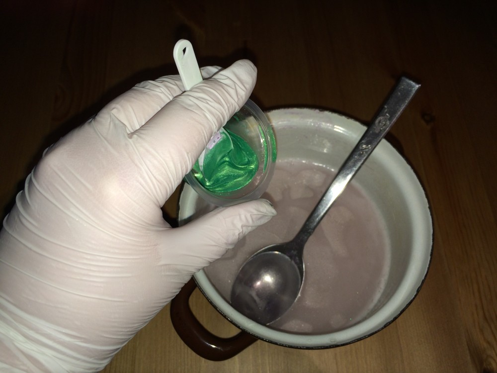 1. Készítsd elő a szükséges hozzávalókat és eszközöket: szappanmassza, festékanyag(csillám ), illóolaj, alkohol a buborékok eltávolításához(a festék- és lakkboltban vásárolhatod meg), egy csésze, amelyben feloldod a szappanmasszát, egy edény a festék keveréséhez, egy forma, egy kanál, védőkesztyű.