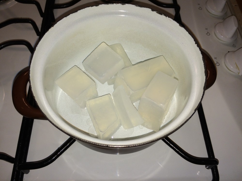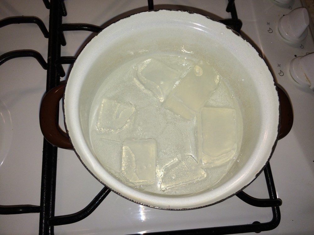4. Az így előkészített szappanmasszát kis lángon feloldjuk, vigyázzunk, a massza nem érheti el a forráspontot, különben nem keményedik meg.