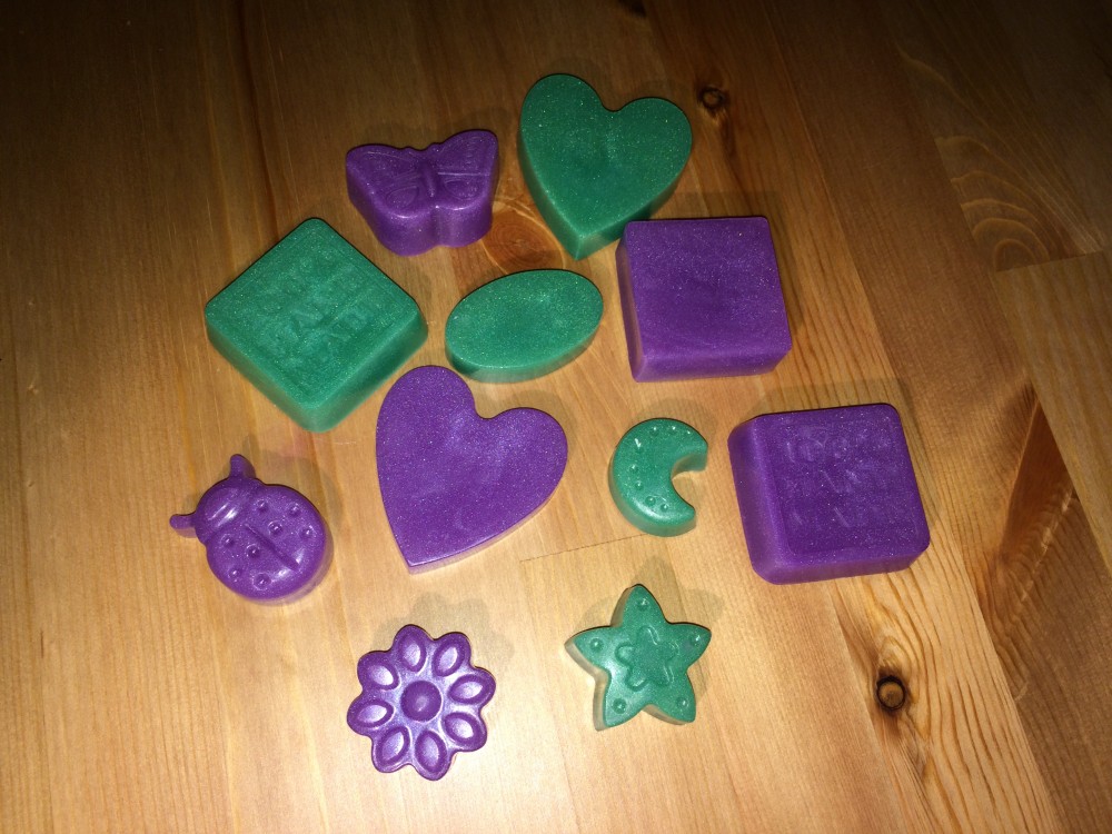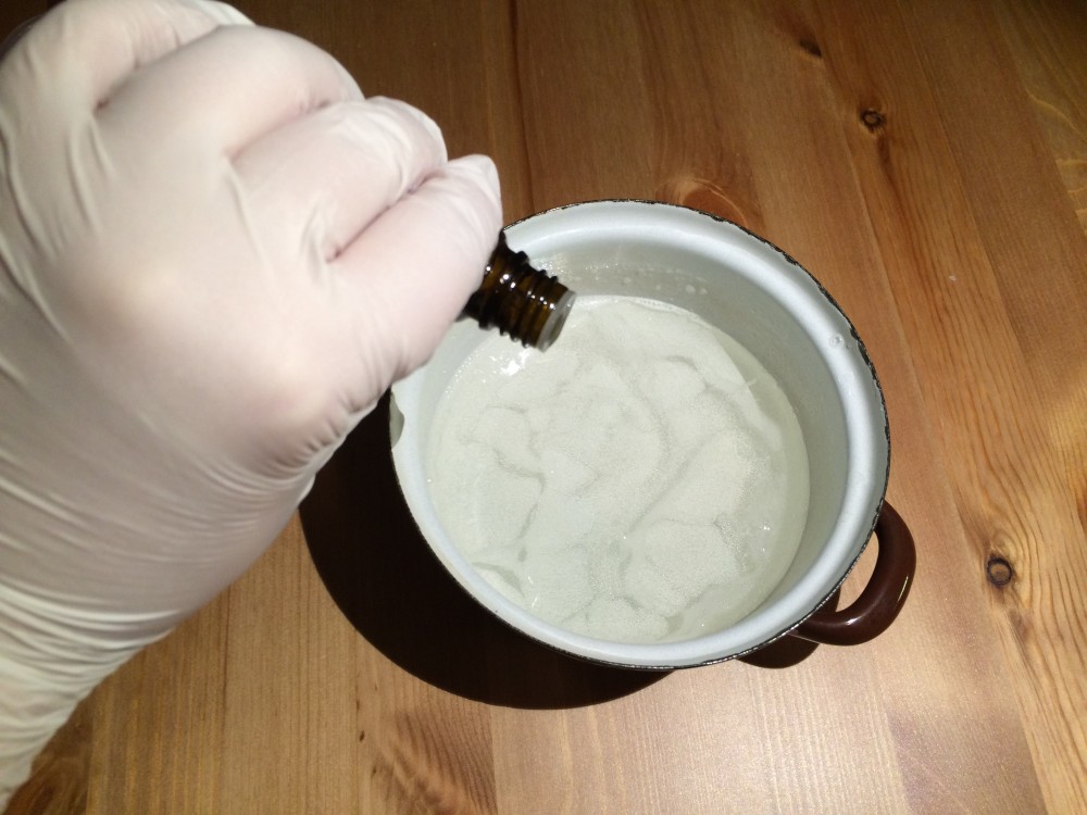 5. Adjuk hozzá az illóolajat és az elkészített festéket az olvasztott szappanmasszához. Ha a massza megkeményedik, akkor melegítsük fel újra egy kicsit. Keverjük bele a színezéket, és öntsük a masszát az előkészített formákba.