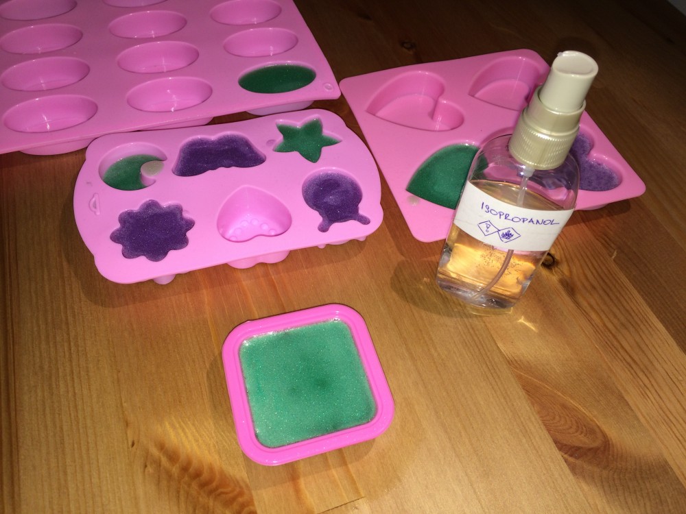 6. Miután a masszát a formákba öntöttük, fújjuk be a szappan tetejét alkohollal, hogy megakadályozzuk a légbuborékok kialakulását.