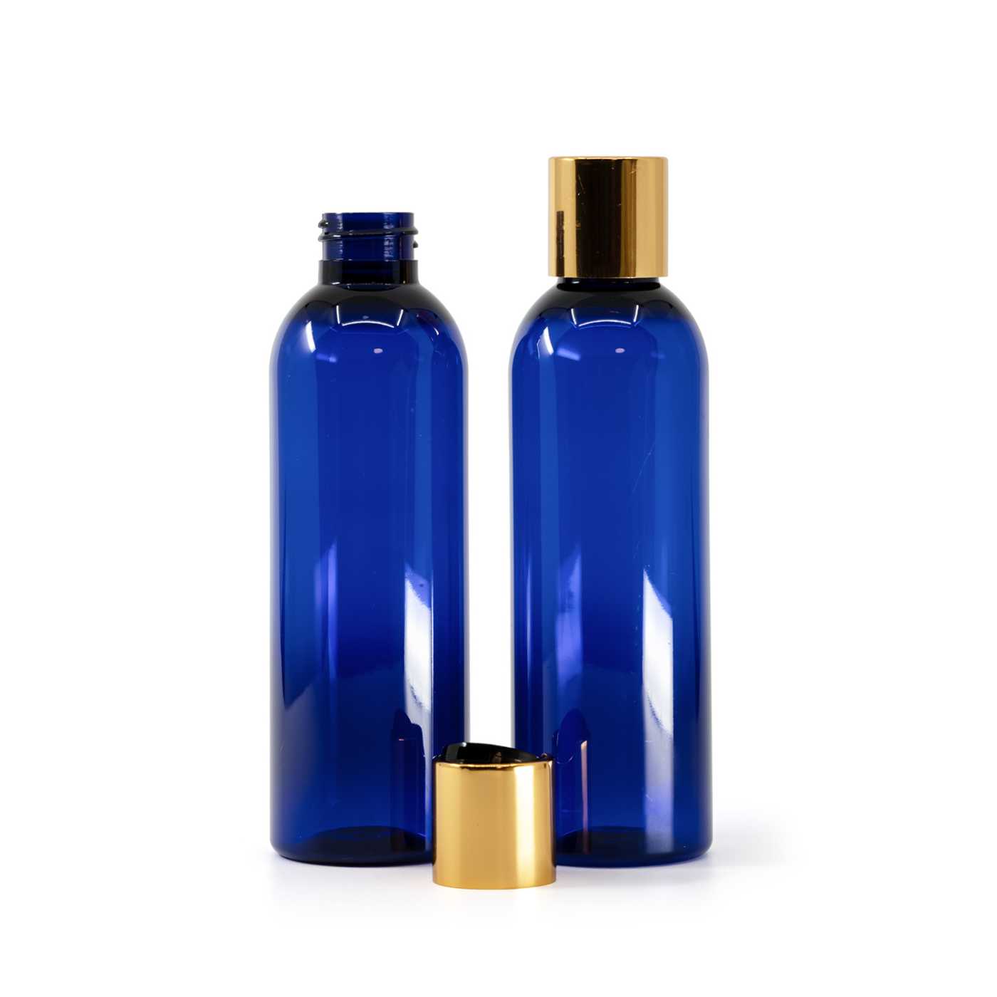 Kék műanyag palack fekete flip-top kupakkal és aranyszínű alumíniumgyűrűvel, 200 ml