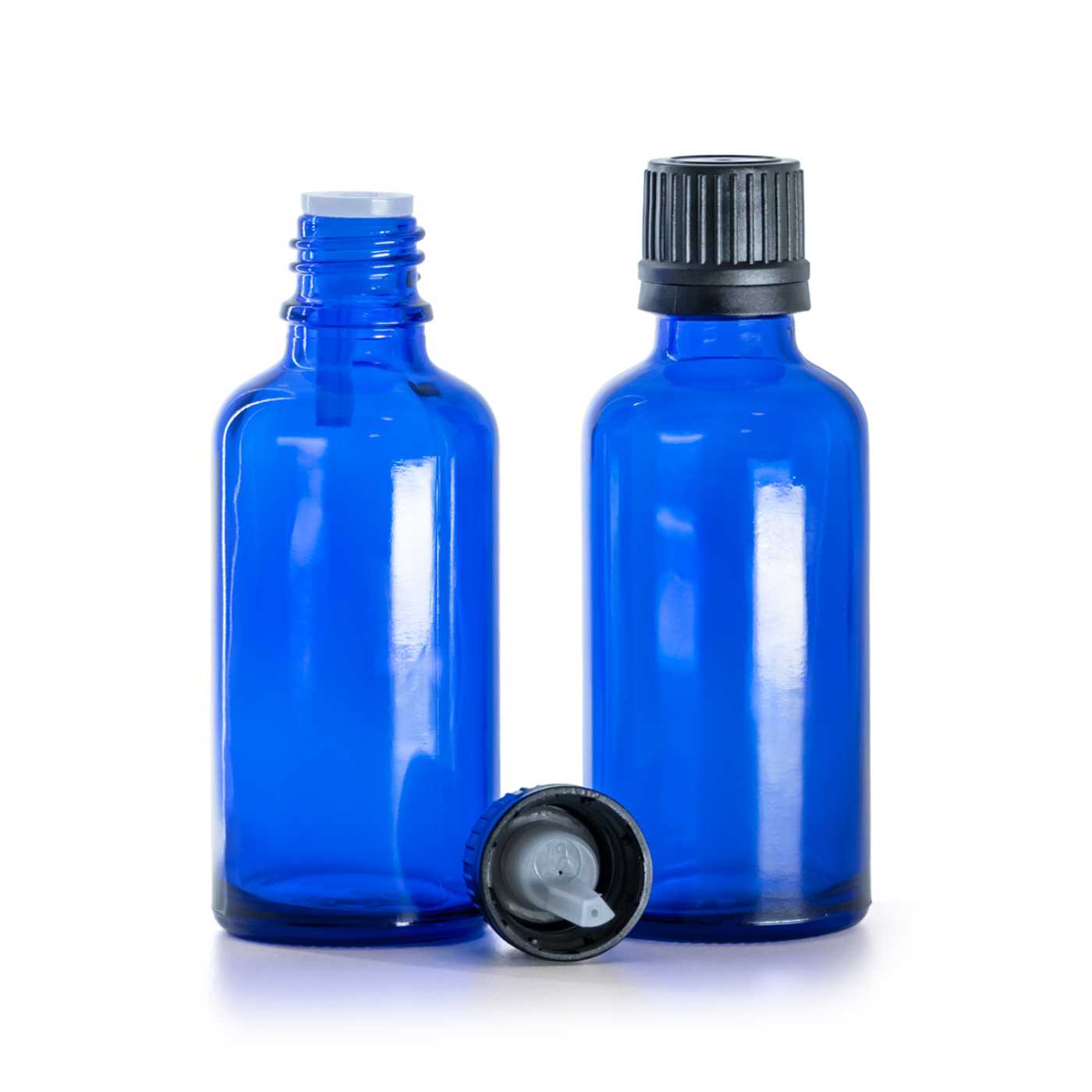 Kék üveg palack fekete cseppentős kupakkal, 50 ml
