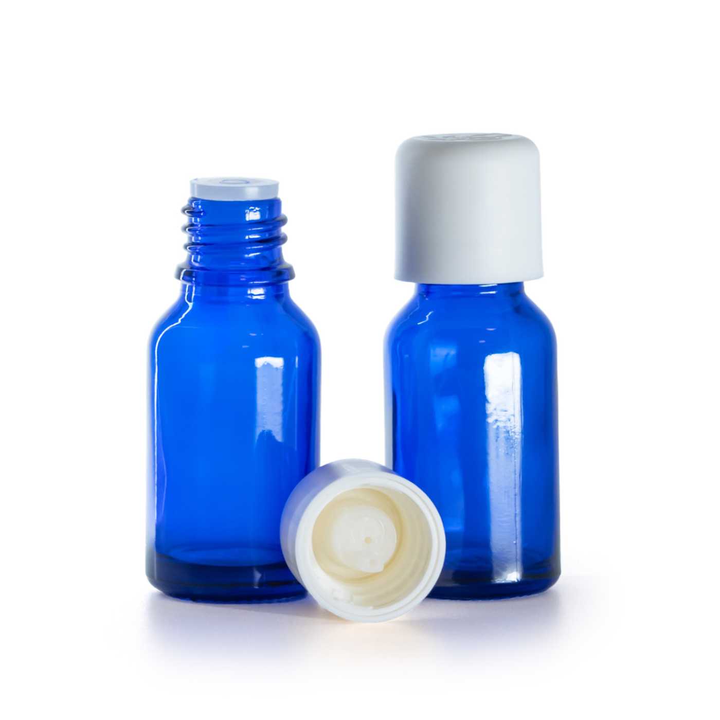 Kék üvegpalack fehér biztonsági kupakkal és cseppentővel 15 ml