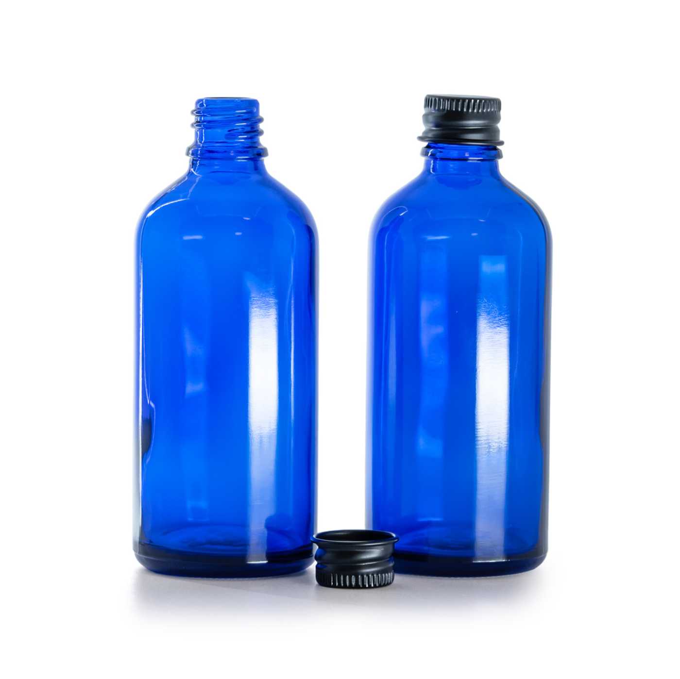 Kék üvegpalack fekete alumínium kupakkal, 100 ml