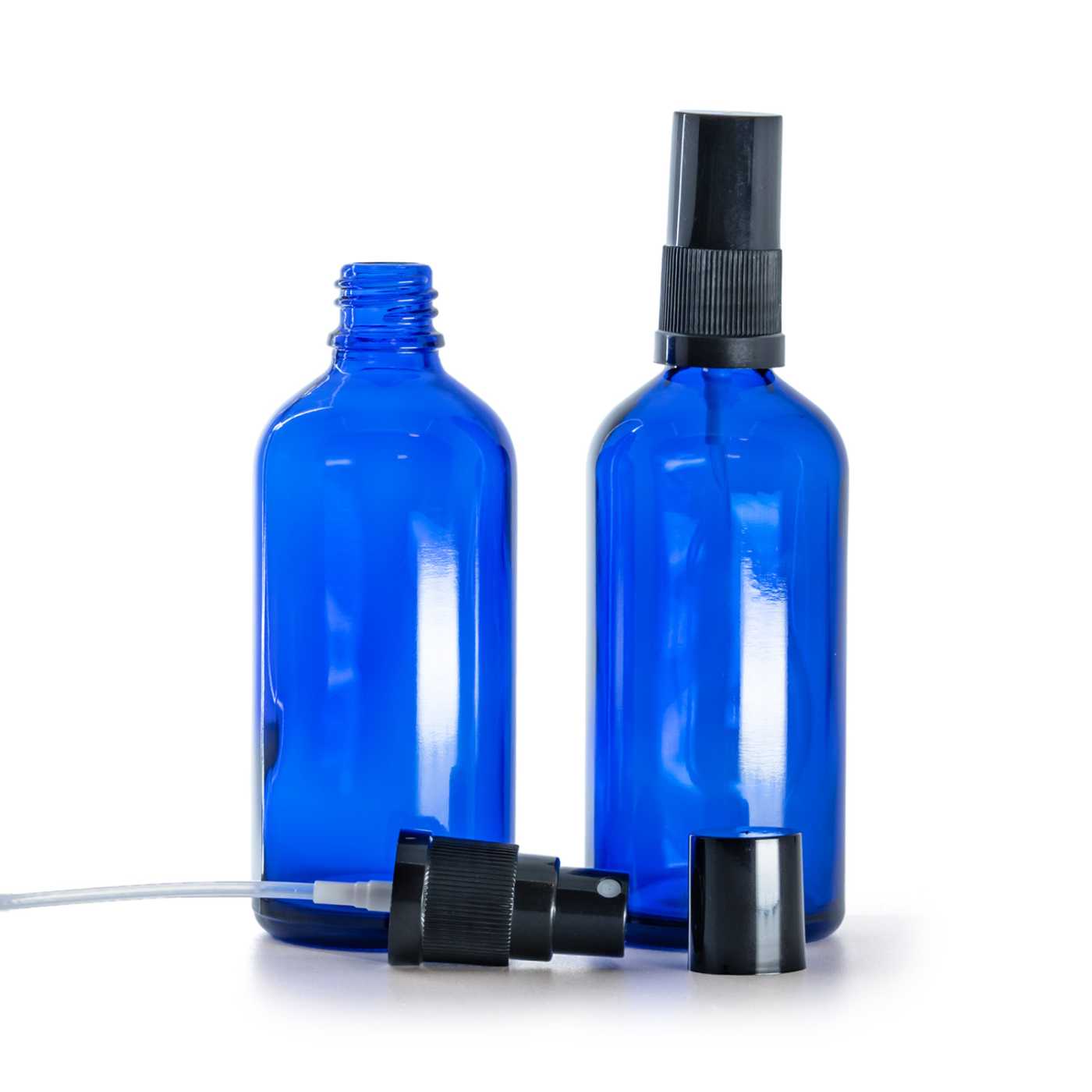 Kék üvegpalack, fekete finompermetező, fekete kupak, 100 ml