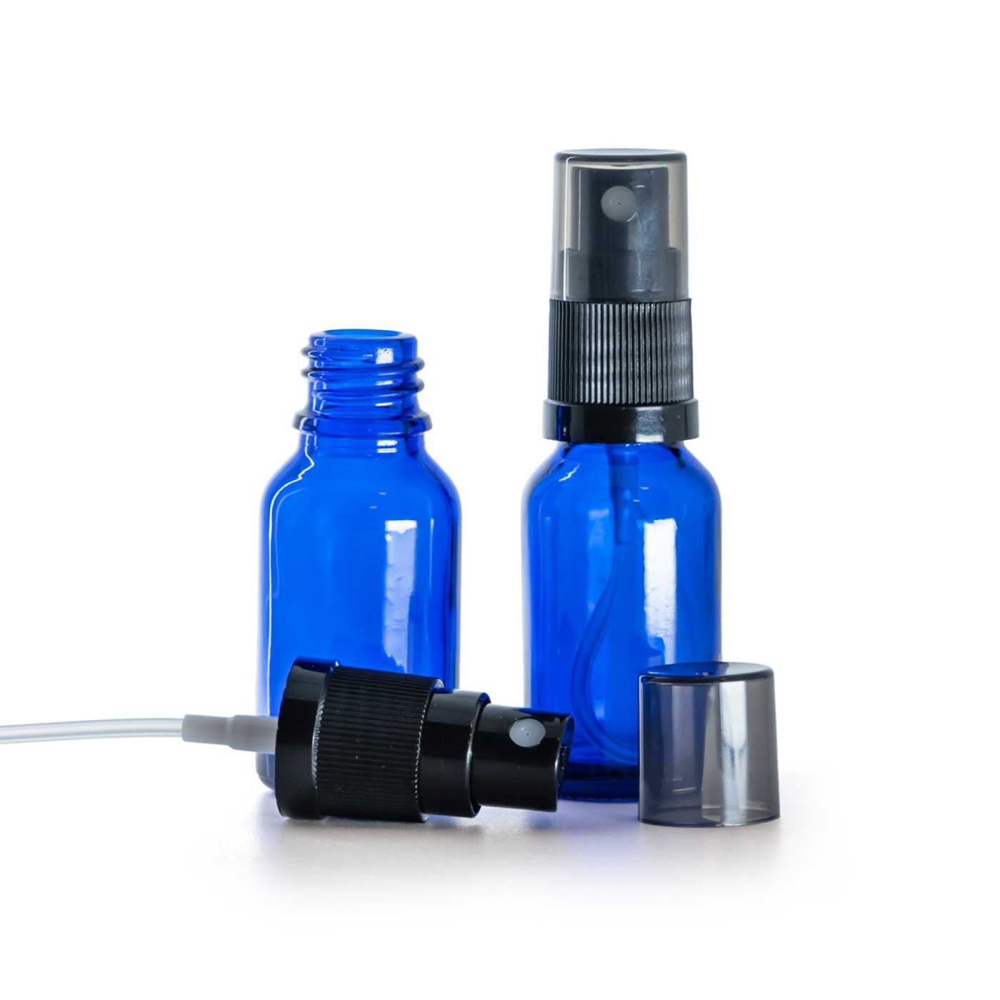 Kék üvegpalack, fekete permetezőfej, füstös kupak, 15 ml